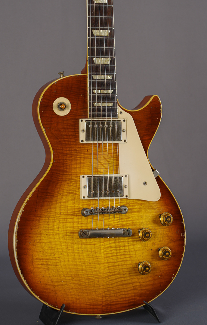 Body: Mahogany Top: Big leaf maple Colour: Faded Burst Neck: Mahogany Fingerboard: vintage Brazilian rosewood Neck shape: ’59 Neck radius: 12″ Nut: vintage bone Nut width: 43,5 mm Frets: 47104 stainless steel Jescar Pickups: Humbucker handwound Panucci Pickup controls: VIP Pots NOS paper in oil caps Bridge: Faber Tunomatic Button Tuners: Gotoh SD 510 Finish: […]